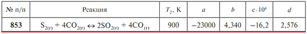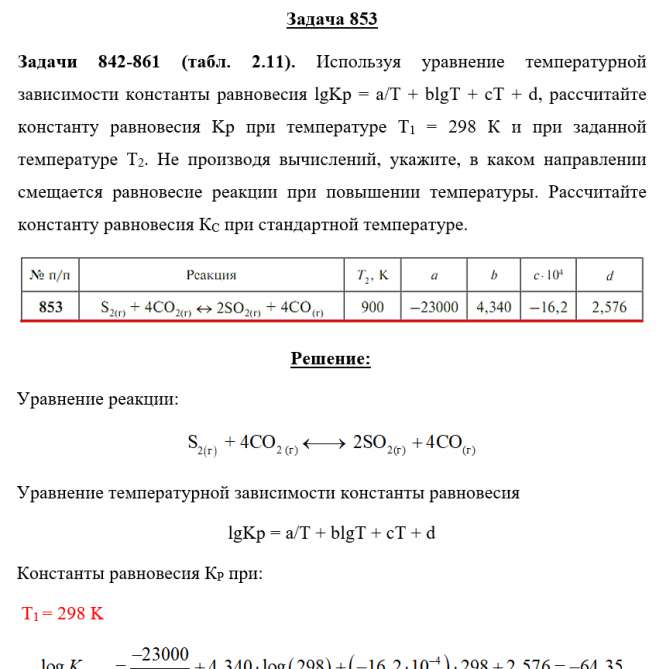 Задача 853 - Используя уравнение температурной зависимости константы равновесия lgKp = a/T + blgT + cT + d, рассчитайте константу равновесия Kp при температуре Т1 = 298 К и при заданной температуре Т2. Не производя вычислений, укажите, в каком направ