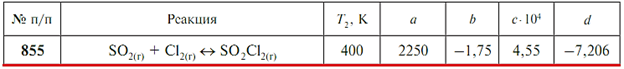 Задачи 842-861 (табл. 2.11). Используя уравнение температурной зависимости константы равновесия lgKp = a/T + blgT + cT + d, рассчитайте константу равновесия Kp при температуре Т1 = 298 К и при заданной температуре Т2. Не производя вычислений, укажите, в каком направлении смещается равновесие реакции при повышении температуры. Рассчитайте константу равновесия КC при стандартной температуре.