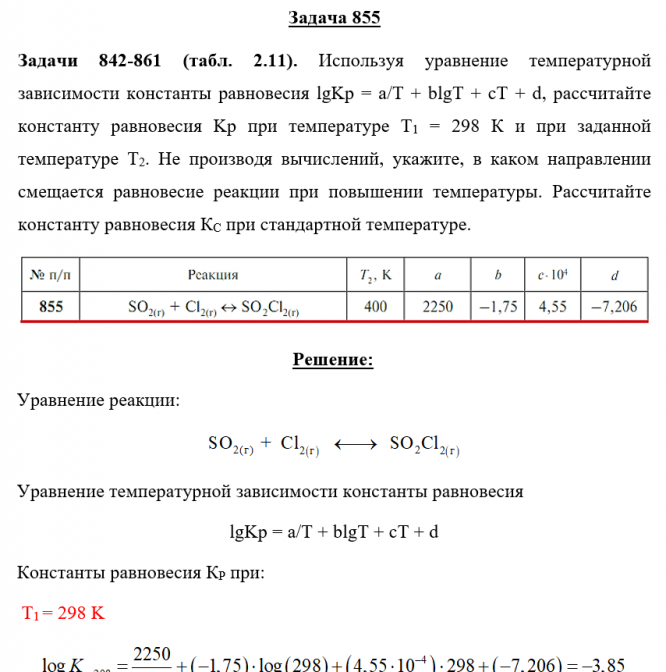 Главная » Учебные материалы » Химия » Решения задач » Несколько классов/семестров » Номер 855 » Задача 855 - Используя уравнение температурной зависимости константы равновесия lgKp = a/T + blgT + cT + d, рассчитайте константу равновесия Kp при температуре Т1 = 298 К и при заданной температуре Т2. Не производя вычислений, укажите, в каком направ