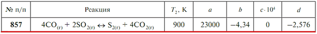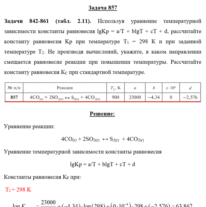 Задача 857 - Используя уравнение температурной зависимости константы равновесия lgKp = a/T + blgT + cT + d, рассчитайте константу равновесия Kp при температуре Т1 = 298 К и при заданной температуре Т2. Не производя вычислений, укажите, в каком направ