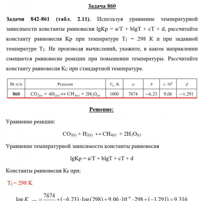 Задача 860 - Используя уравнение температурной зависимости константы равновесия lgKp = a/T + blgT + cT + d, рассчитайте константу равновесия Kp при температуре Т1 = 298 К и при заданной температуре Т2. Не производя вычислений, укажите, в каком направ