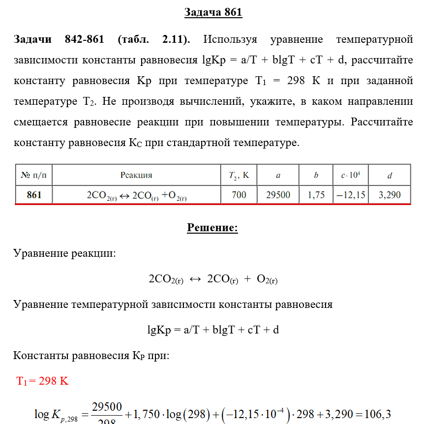 Задача 861 - Используя уравнение температурной зависимости константы равновесия lgKp = a/T + blgT + cT + d, рассчитайте константу равновесия Kp при температуре Т1 = 298 К и при заданной температуре Т2. Не производя вычислений, укажите, в каком направ