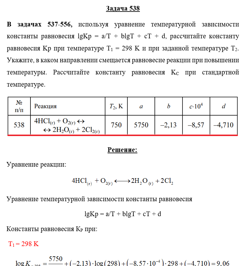Задача 538 - используя уравнение температурной зависимости константы равновесия lgKp = a/T + blgT + cT + d, рассчитайте константу равновесия Kр при температуре Т1 = 298 K и при заданной температуре Т2. Укажите, в каком направлении смещается равновеси