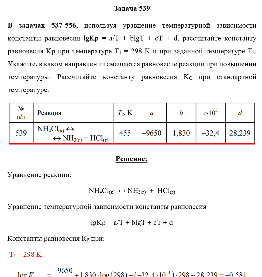 Для студентов по предмету ХимияЗадача 539 - используя уравнение температурной зависимости константы равновесия lgKp = a/T + blgT + cT + d, рассчитайте константу равновесия Kр при теЗадача 539 - используя уравнение температурной зависимости константы равновесия lgKp = a/T + blgT + cT + d, рассчитайте константу равновесия Kр при те