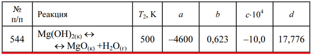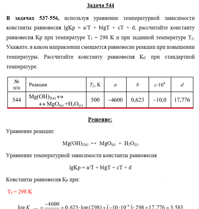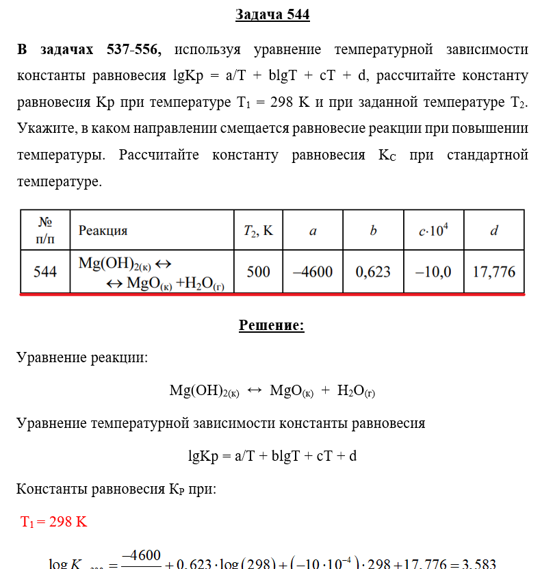 Задача 544 - используя уравнение температурной зависимости константы равновесия lgKp = a/T + blgT + cT + d, рассчитайте константу равновесия Kр при температуре Т1 = 298 K и при заданной температуре Т2. Укажите, в каком направлении смещается равновеси