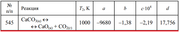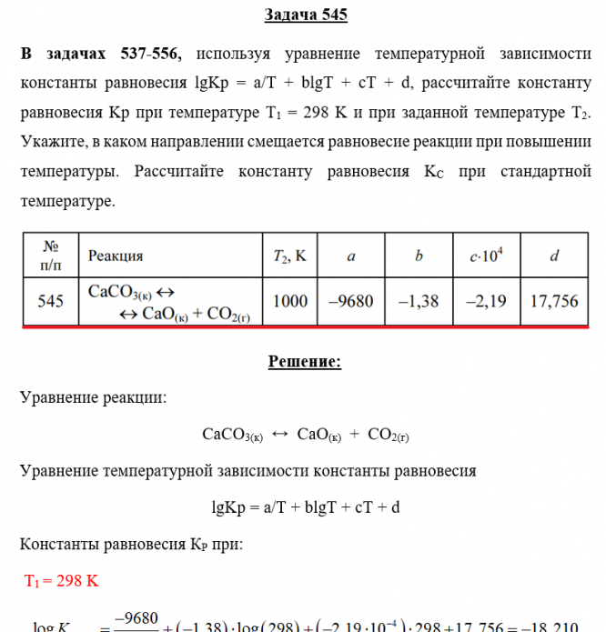 Задача 545 - используя уравнение температурной зависимости константы равновесия lgKp = a/T + blgT + cT + d, рассчитайте константу равновесия Kр при температуре Т1 = 298 K и при заданной температуре Т2. Укажите, в каком направлении смещается равновеси