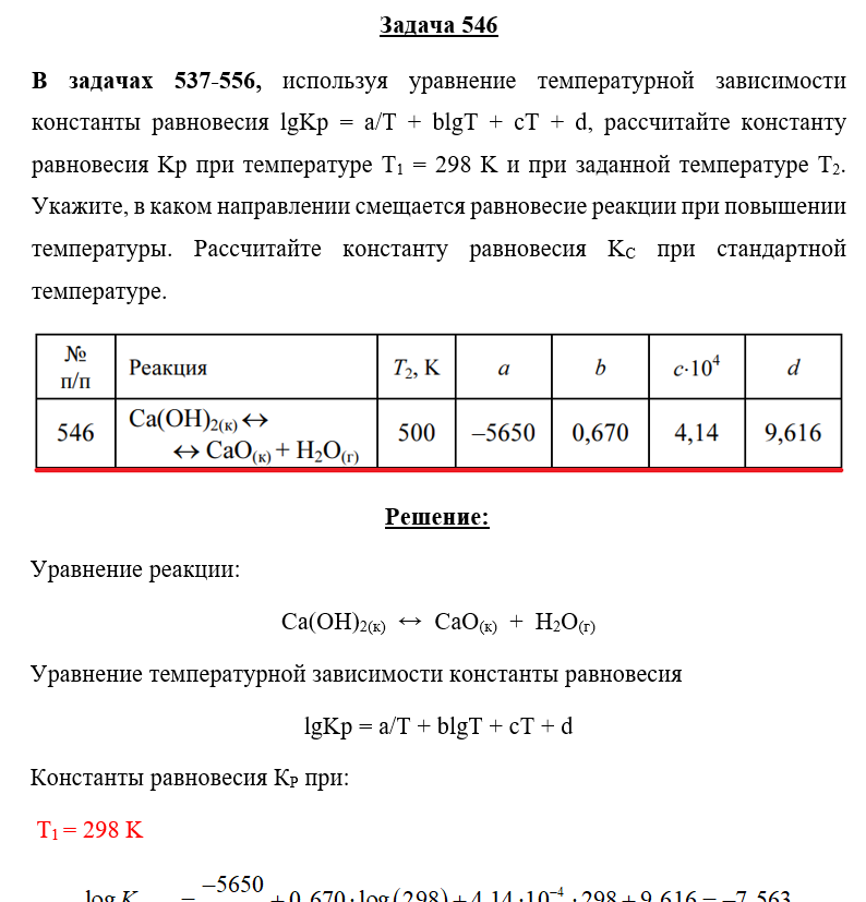 Для студентов по предмету ХимияЗадача 546 - используя уравнение температурной зависимости константы равновесия lgKp = a/T + blgT + cT + d, рассчитайте константу равновесия Kр при теЗадача 546 - используя уравнение температурной зависимости константы равновесия lgKp = a/T + blgT + cT + d, рассчитайте константу равновесия Kр при те