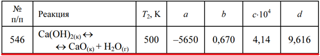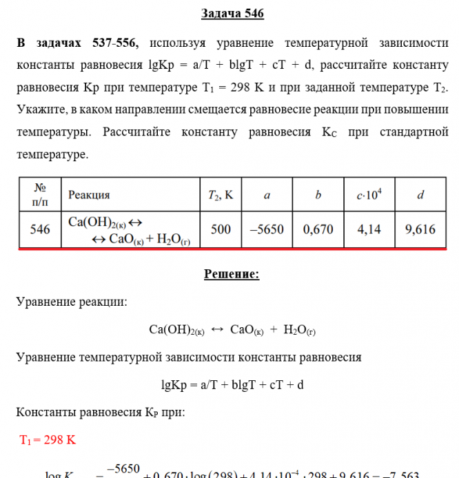 Задача 546 - используя уравнение температурной зависимости константы равновесия lgKp = a/T + blgT + cT + d, рассчитайте константу равновесия Kр при температуре Т1 = 298 K и при заданной температуре Т2. Укажите, в каком направлении смещается равновеси