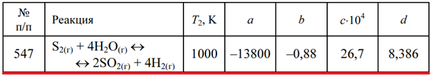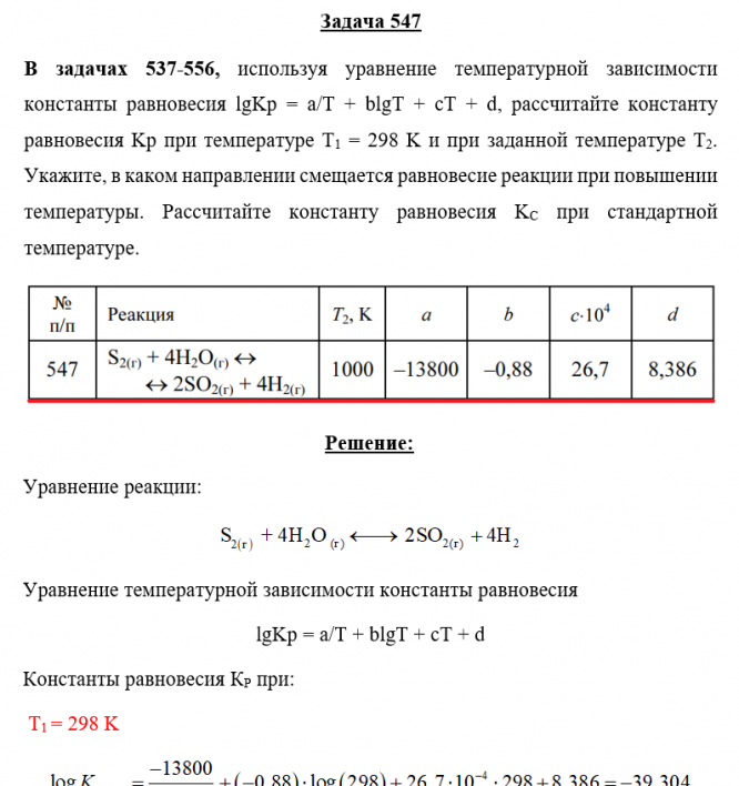 Задача 547 - используя уравнение температурной зависимости константы равновесия lgKp = a/T + blgT + cT + d, рассчитайте константу равновесия Kр при температуре Т1 = 298 K и при заданной температуре Т2. Укажите, в каком направлении смещается равновеси