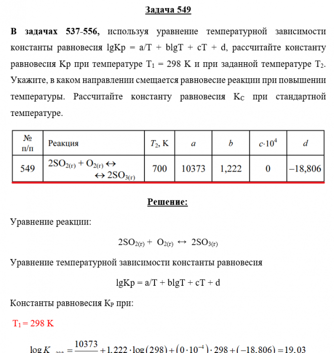 Для студентов по предмету ХимияЗадача 549 - используя уравнение температурной зависимости константы равновесия lgKp = a/T + blgT + cT + d, рассчитайте константу равновесия Kр при теЗадача 549 - используя уравнение температурной зависимости константы равновесия lgKp = a/T + blgT + cT + d, рассчитайте константу равновесия Kр при те