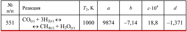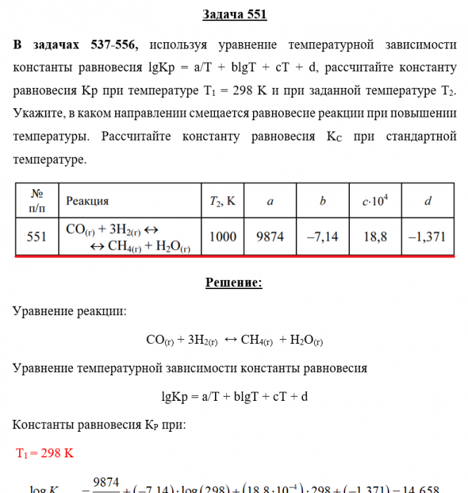 Задача 551 - используя уравнение температурной зависимости константы равновесия lgKp = a/T + blgT + cT + d, рассчитайте константу равновесия Kр при температуре Т1 = 298 K и при заданной температуре Т2. Укажите, в каком направлении смещается равновеси