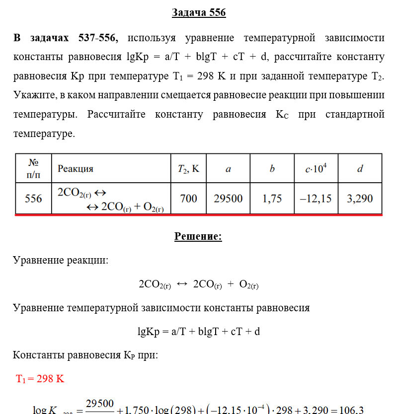 Задача 556 - используя уравнение температурной зависимости константы равновесия lgKp = a/T + blgT + cT + d, рассчитайте константу равновесия Kр при температуре Т1 = 298 K и при заданной температуре Т2. Укажите, в каком направлении смещается равновеси
