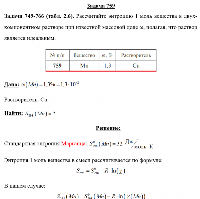 Задачи 749-766 (табл. 2.6). Рассчитайте энтропию 1 моль вещества в двух-компонентном растворе при известной массовой доле ω, полагая, что раствор является идеальным..