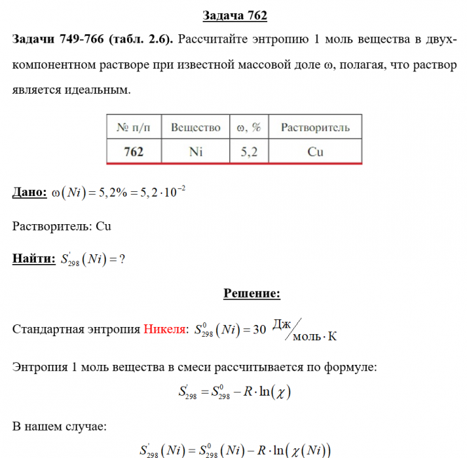 Главная » Учебные материалы » Химия » Решения задач » Несколько классов/семестров » Номер 762 » Задачи 762 - Рассчитайте энтропию 1 моль вещества в двух-компонентном растворе при известной массовой доле ω, полагая, что раствор является идеальным.