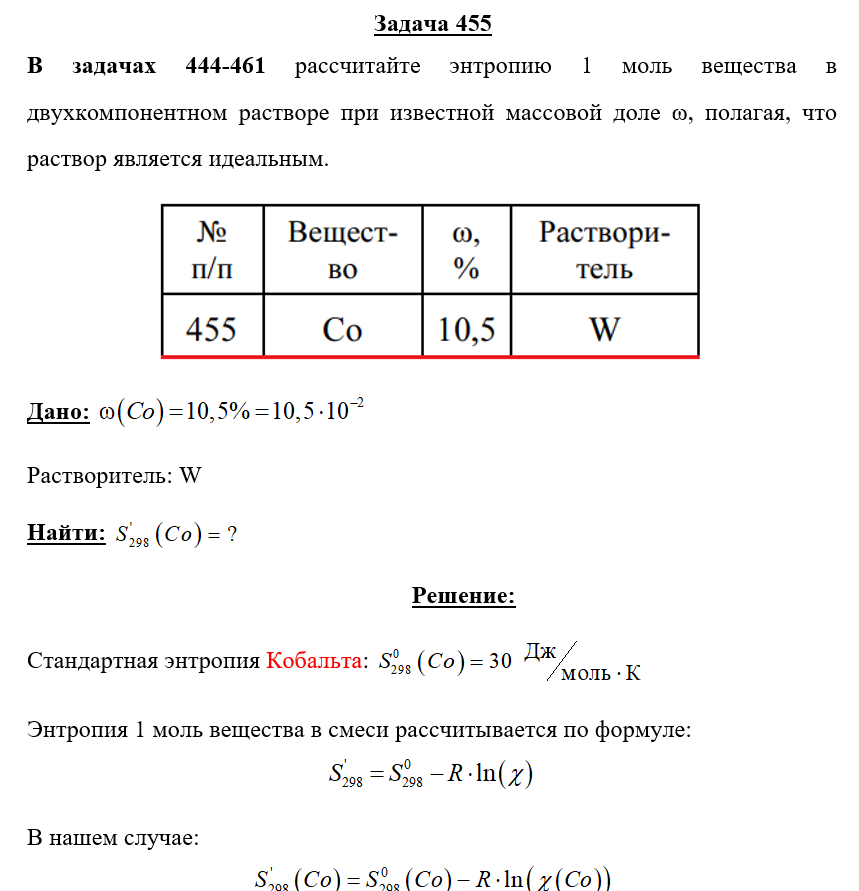 Для студентов по предмету ХимияЗадача 455 - рассчитайте энтропию 1 моль вещества в двухкомпонентном растворе при известной массовой доле ω, полагая, что раствор является идеальным.Задача 455 - рассчитайте энтропию 1 моль вещества в двухкомпонентном растворе при известной массовой доле ω, полагая, что раствор является идеальным.