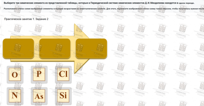 Выберите три химических элемента из представленной таблицы, которые в Периодической системе химических элементов Д. И. Менделеева находятся в одном периоде. Расположите в блок-схеме выбранные элементы в порядке возрастания их неметаллических свойств. Для этого, перенесите изображения в блок-схему таким образом, чтобы получилась нужная последовательность..
