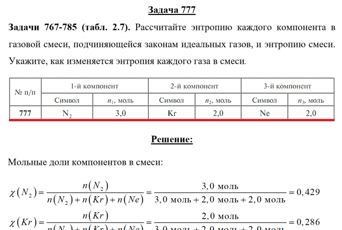Задача 777 - Рассчитайте энтропию каждого компонента в газовой смеси, подчиняющейся законам идеальных газов, и энтропию смеси. Укажите, как изменяется энтропия каждого газа в смеси.