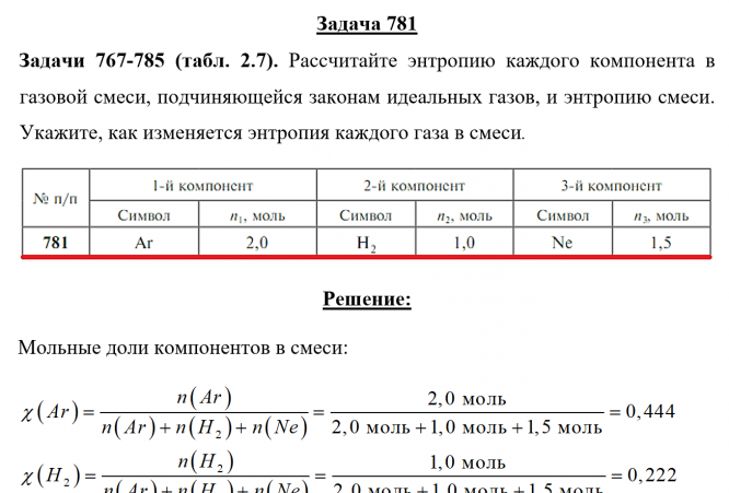 Задача 781 - Рассчитайте энтропию каждого компонента в газовой смеси, подчиняющейся законам идеальных газов, и энтропию смеси. Укажите, как изменяется энтропия каждого газа в смеси.