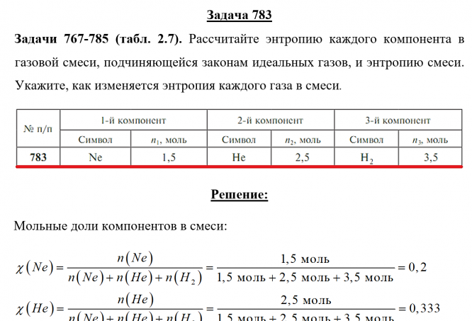 Задача 783 - Рассчитайте энтропию каждого компонента в газовой смеси, подчиняющейся законам идеальных газов, и энтропию смеси. Укажите, как изменяется энтропия каждого газа в смеси.
