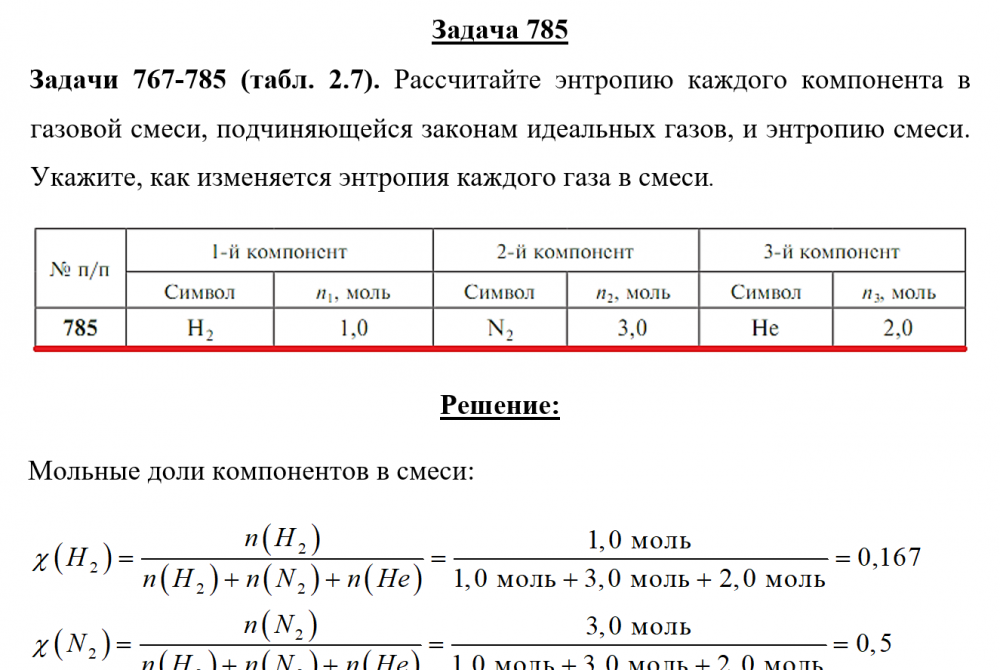 Задача 785 - Рассчитайте энтропию каждого компонента в газовой смеси, подчиняющейся законам идеальных газов, и энтропию смеси. Укажите, как изменяется энтропия каждого газа в смеси.