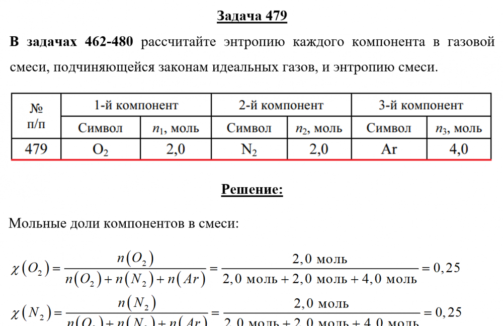 Задача 479 - рассчитайте энтропию каждого компонента в газовой смеси, подчиняющейся законам идеальных газов, и энтропию смеси.