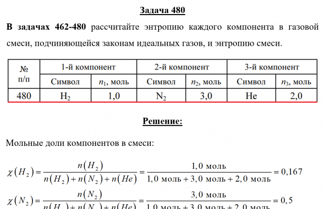 Главная » Учебные материалы » Химия » Решения задач » Несколько классов/семестров » Номер 480 » Задача 480 - рассчитайте энтропию каждого компонента в газовой смеси, подчиняющейся законам идеальных газов, и энтропию смеси.