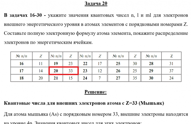Задача 20 - укажите значения квантовых чисел n, l и ml для электронов внешнего энергетического уровня в атомах элементов с порядковыми номерами Z. Составьте полную электронную формулу атома элемента, покажите распределение электронов по энергетически