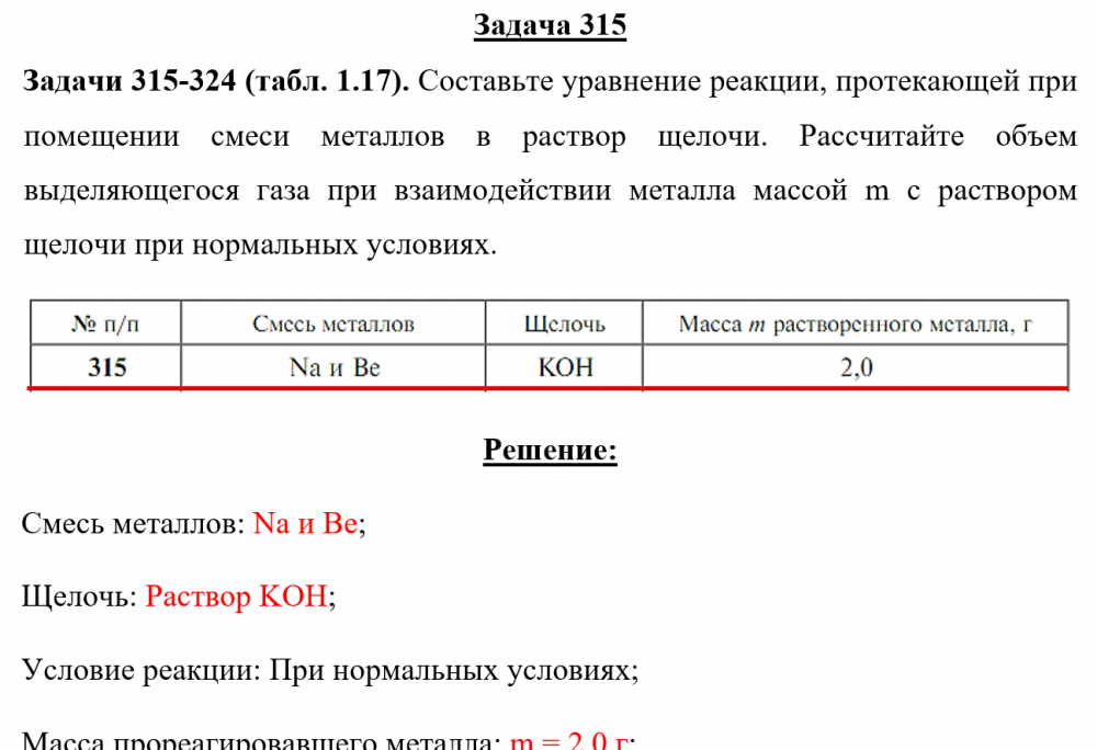 Показать/скрыть дополнительное описаниеЗадачи 315-324 (табл. 1.17). Составьте уравнение реакции, протекающей при помещении смеси металлов в раствор щелочи. Рассчитайте объем выделяющегося газа при взаимодействии металла массой m с раствором щелочи при нормальных условиях..