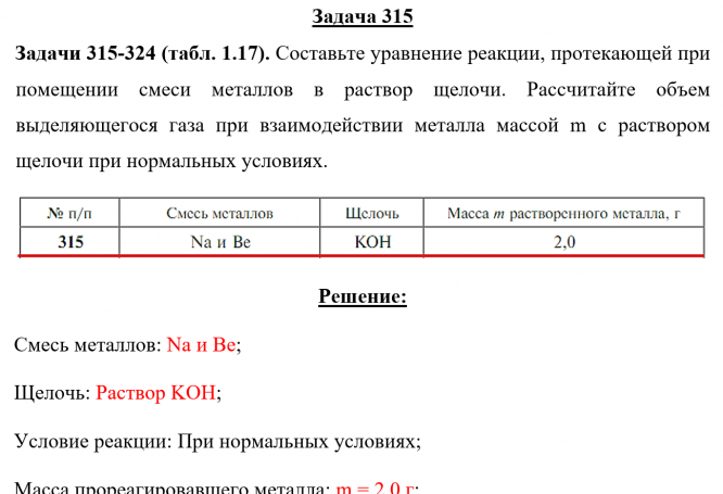 Задача 315 - Составьте уравнение реакции, протекающей при помещении смеси металлов в раствор щелочи. Рассчитайте объем выделяющегося газа при взаимодействии металла массой m с раствором щелочи при нормальных условиях.