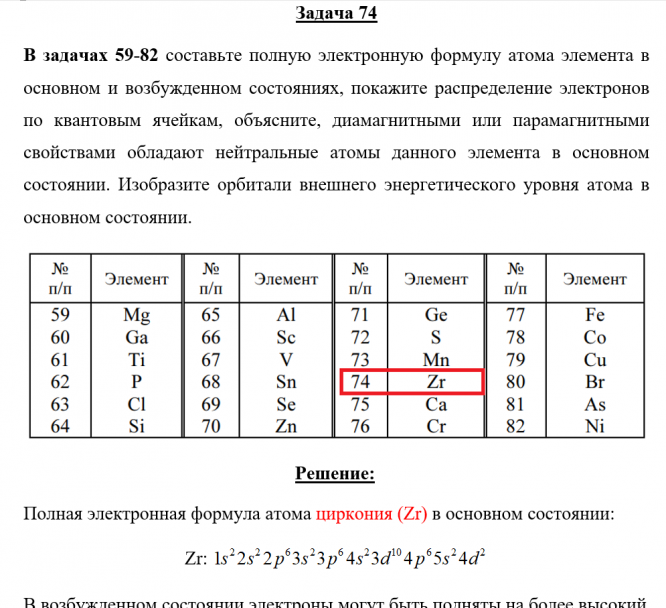Задача 74 - составьте полную электронную формулу атома элемента в основном и возбужденном состояниях, покажите распределение электронов по квантовым ячейкам, объясните, диамагнитными или парамагнитными свойствами обладают нейтральные атомы данного эл