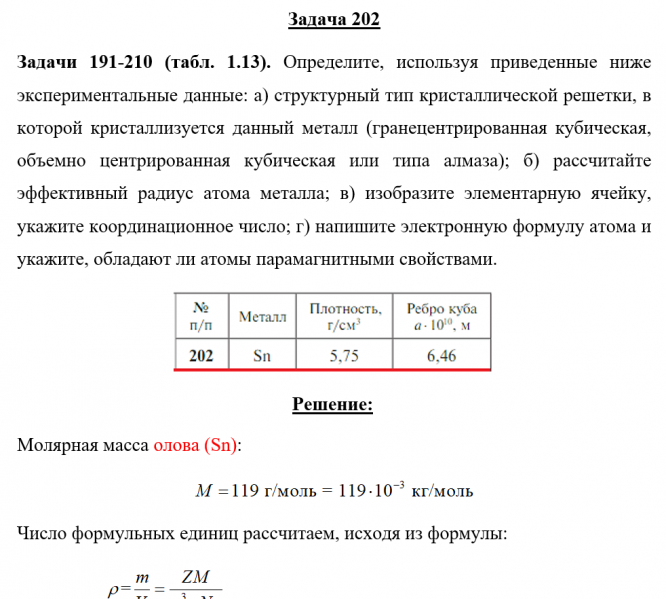 Задачи 191-210 (табл. 1.13). Определите, используя приведенные ниже экспериментальные данные: а) структурный тип кристаллической решетки, в которой кристаллизуется данный металл (гранецентрированная кубическая, объемно центрированная кубическая или типа алмаза); б) рассчитайте эффективный радиус атома металла; в) изобразите элементарную ячейку, укажите координационное число; г) напишите электронную формулу атома и укажите, обладают ли атомы парамагнитными свойствами.