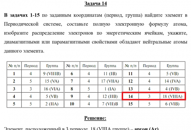 Задача 14 - по заданным координатам (период, группа) найдите элемент в Периодической системе, составьте полную электронную формулу атома, изобразите распределение электронов по энергетическим ячейкам, укажите, диамагнитными или парамагнитными свойств
