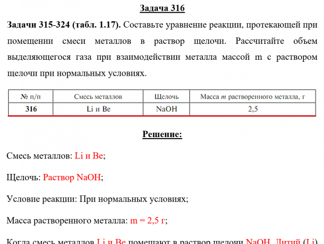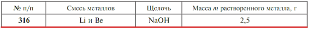 Задача 316 - Составьте уравнение реакции, протекающей при помещении смеси металлов в раствор щелочи. Рассчитайте объем выделяющегося газа при взаимодействии металла массой m с раствором щелочи при нормальных условиях.