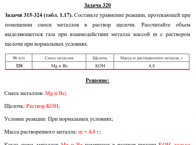 Задача 320 - Составьте уравнение реакции, протекающей при помещении смеси металлов в раствор щелочи. Рассчитайте объем выделяющегося газа при взаимодействии металла массой m с раствором щелочи при нормальных условиях.