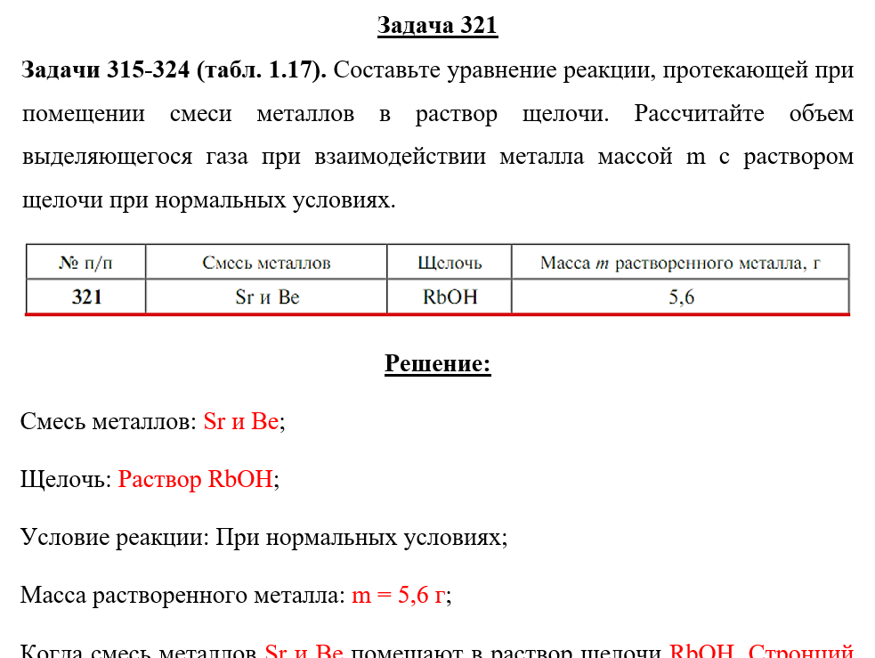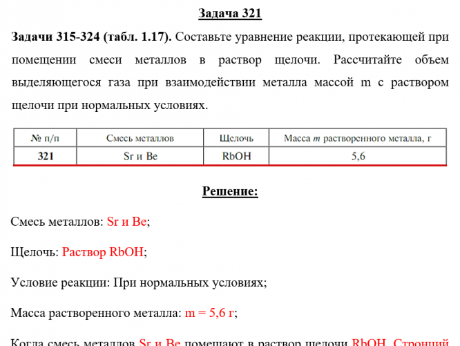 Задача 321 - Составьте уравнение реакции, протекающей при помещении смеси металлов в раствор щелочи. Рассчитайте объем выделяющегося газа при взаимодействии металла массой m с раствором щелочи при нормальных условиях.