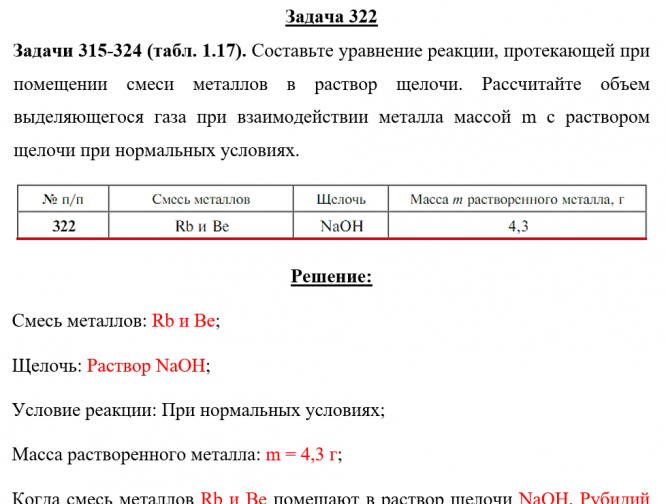 Задача 322 - Составьте уравнение реакции, протекающей при помещении смеси металлов в раствор щелочи. Рассчитайте объем выделяющегося газа при взаимодействии металла массой m с раствором щелочи при нормальных условиях.