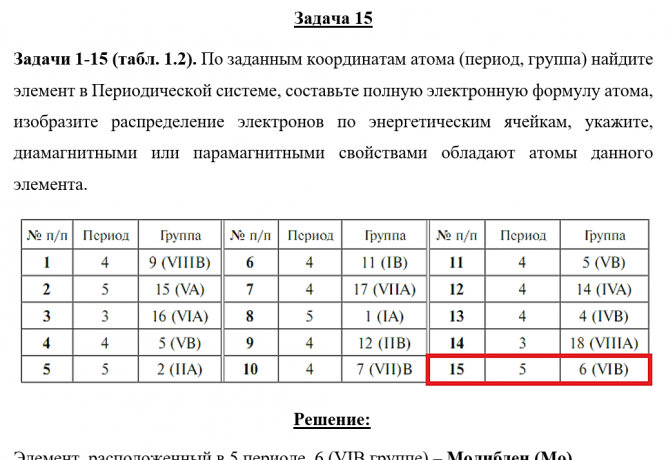 Задачи 1-15 (табл. 1.2). По заданным координатам атома (период, группа) найдите элемент в Периодической системе, составьте полную электронную формулу атома, изобразите распределение электронов по энергетическим ячейкам, укажите, диамагнитными или парамагнитными свойствами обладают атомы данного элемента..
