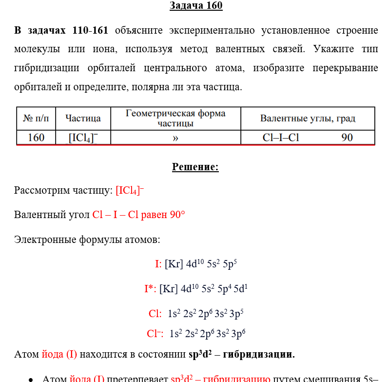 Задача 160 - объясните экспериментально установленное строение молекулы или иона, используя метод валентных связей. Укажите тип гибридизации орбиталей центрального атома, изобразите перекрывание орбиталей и определите, полярна ли эта частица.