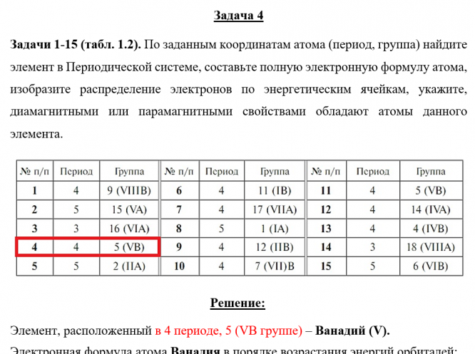 Задача 4 - По заданным координатам атома (период, группа) найдите элемент в Периодической системе, составьте полную электронную формулу атома, изобразите распределение электронов по энергетическим ячейкам, укажите, диамагнитными или парамагнитными с