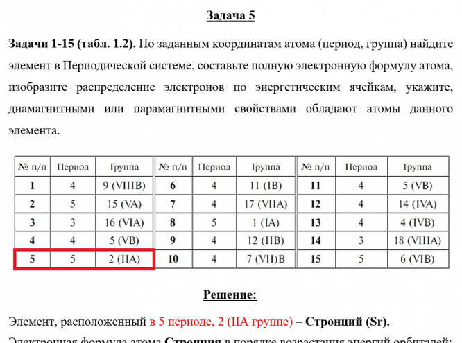 Задача 5 - По заданным координатам атома (период, группа) найдите элемент в Периодической системе, составьте полную электронную формулу атома, изобразите распределение электронов по энергетическим ячейкам, укажите, диамагнитными или парамагнитными с
