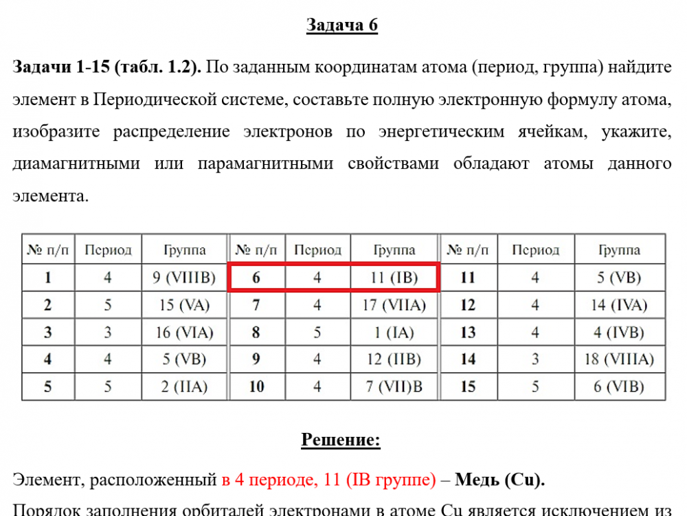 Задача 6 - По заданным координатам атома (период, группа) найдите элемент в Периодической системе, составьте полную электронную формулу атома, изобразите распределение электронов по энергетическим ячейкам, укажите, диамагнитными или парамагнитными с