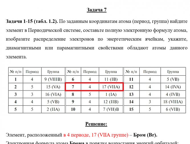 Задача 7 - По заданным координатам атома (период, группа) найдите элемент в Периодической системе, составьте полную электронную формулу атома, изобразите распределение электронов по энергетическим ячейкам, укажите, диамагнитными или парамагнитными с