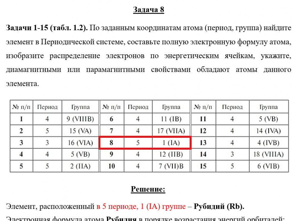 Задача 8 - По заданным координатам атома (период, группа) найдите элемент в Периодической системе, составьте полную электронную формулу атома, изобразите распределение электронов по энергетическим ячейкам, укажите, диамагнитными или парамагнитными с