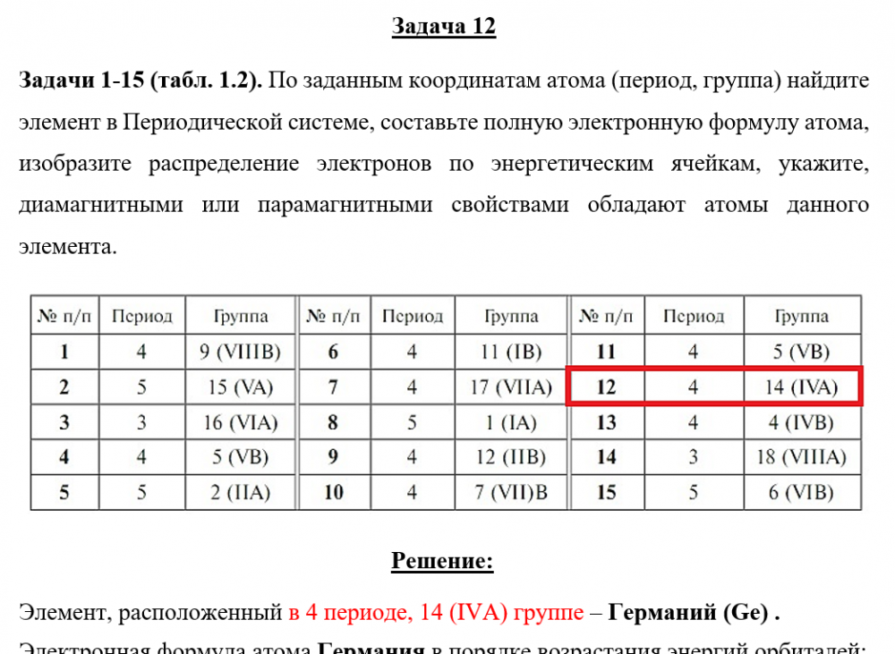 Задача 12 - По заданным координатам атома (период, группа) найдите элемент в Периодической системе, составьте полную электронную формулу атома, изобразите распределение электронов по энергетическим ячейкам, укажите, диамагнитными или парамагнитными с