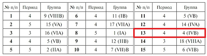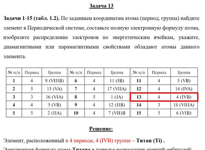 Задача 13 - По заданным координатам атома (период, группа) найдите элемент в Периодической системе, составьте полную электронную формулу атома, изобразите распределение электронов по энергетическим ячейкам, укажите, диамагнитными или парамагнитными с