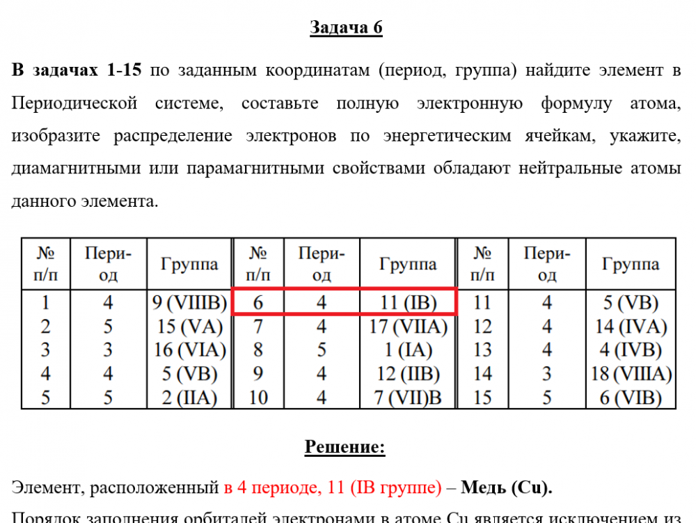 Задача 6 - по заданным координатам (период, группа) найдите элемент в Периодической системе, составьте полную электронную формулу атома, изобразите распределение электронов по энергетическим ячейкам, укажите, диамагнитными или парамагнитными свойств