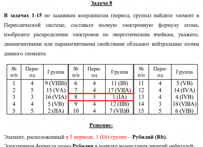 Задача 8 - по заданным координатам (период, группа) найдите элемент в Периодической системе, составьте полную электронную формулу атома, изобразите распределение электронов по энергетическим ячейкам, укажите, диамагнитными или парамагнитными свойств