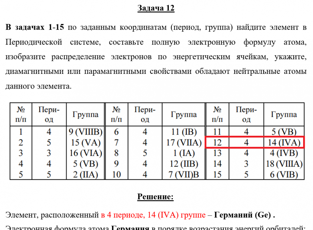 Задача 12 - по заданным координатам (период, группа) найдите элемент в Периодической системе, составьте полную электронную формулу атома, изобразите распределение электронов по энергетическим ячейкам, укажите, диамагнитными или парамагнитными свойств