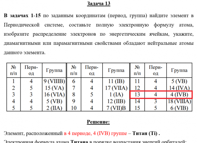 Задача 13 - по заданным координатам (период, группа) найдите элемент в Периодической системе, составьте полную электронную формулу атома, изобразите распределение электронов по энергетическим ячейкам, укажите, диамагнитными или парамагнитными свойств