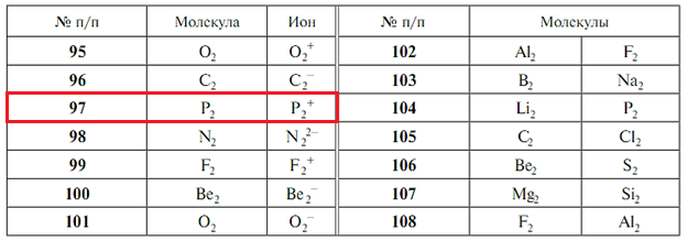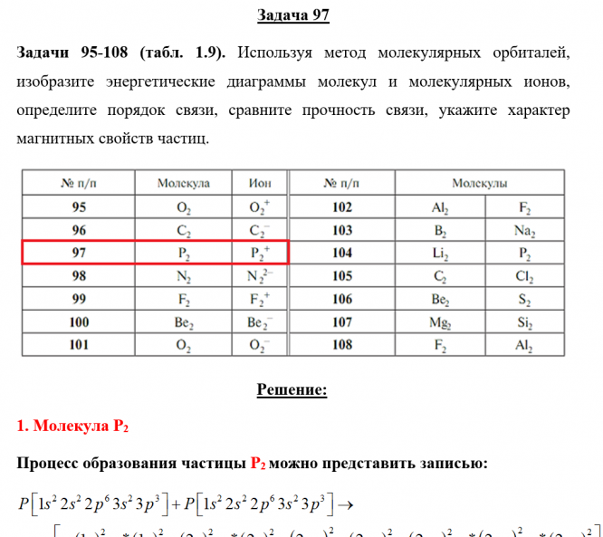 Задачи 95-108 (табл. 1.9). Используя метод молекулярных орбиталей, изобразите энергетические диаграммы молекул и молекулярных ионов, определите порядок связи, сравните прочность связи, укажите характер магнитных свойств частиц..